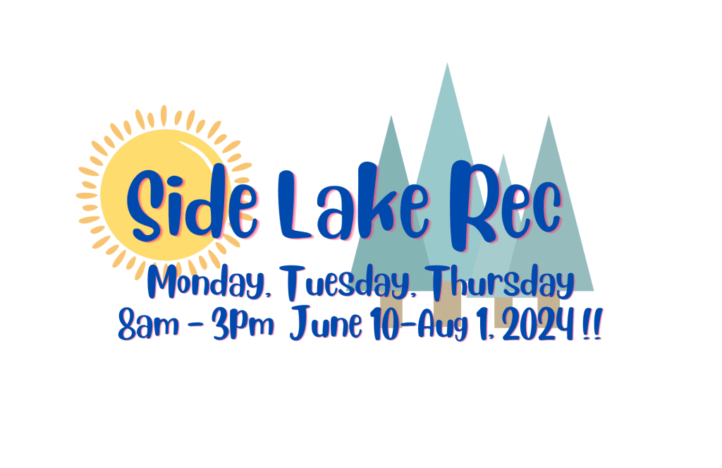 Registration fee is $60. Summer Rec will be at the Side Lake Rec Center every Monday, Tuesday, and Thursday, 8:00 am to 3:00 pm, from June 10th to August 1st.